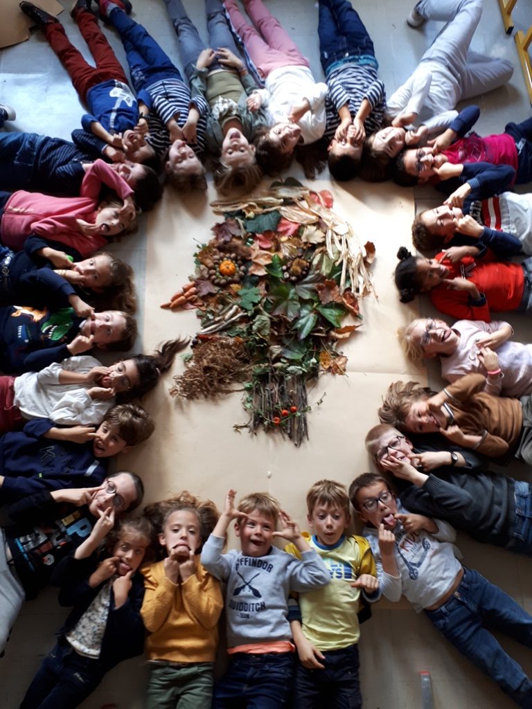 Nous avons partagé nos idées, fait et défait… puis nous avons réussi à nous mettre d’accord. Nous avons décidé d’utiliser les feuilles pour faire le fond. Chacun a posé un élément jusqu’à la réalisation finale.
